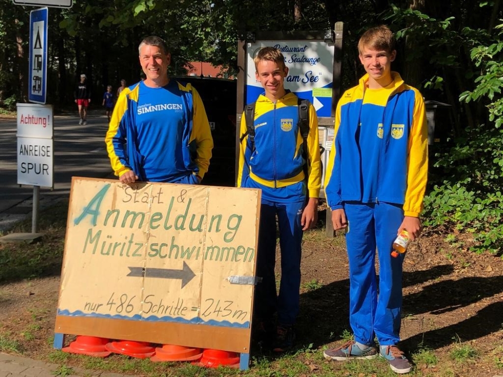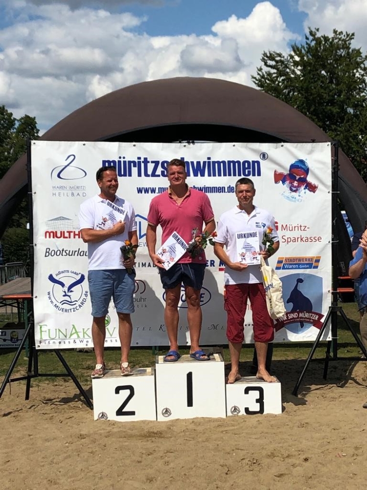 Auch während der Sommerferien nimmt das Schwimmteam Erzgebirge an schwimmsportlichen Events teil. So auch gestern beim 50. Müritzschwimmen in Waren an der Müritz. Hierbei querten die drei Teilnehmer des STE die Binnenmüritz mit ca. 800 anderen Schwimmern und Schwimmerinnen. Das vom Start 1.950m entfernte Ziel erreichte Konrad Weiß vor seinem Bruder Johann und seinem Vater Matthias als erster. Mit einer Zeit von 30:00,50 schaffte er es, sich Platz 21 der Männerwertung zu sichern. Nur 26 Sekunden und 9 Plätze hinter ihm schlug auch sein Bruder Johann am Ziel an. Matthias Weiß kam fast zeitgleich mit ihm ins Ziel und erreichte damit Platz drei in seiner Altersklassenwertung.
