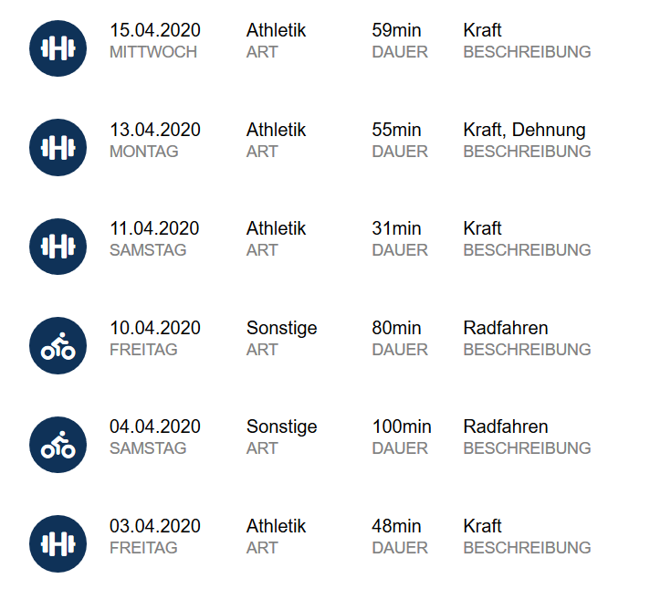 Die Sportler der Kadergruppe nutzen bereits fleißig die Trainingsfunktion unseres internen Bereiches. Diese ist nun auch für die Talentegruppe freigeschaltet. Um die Trainingsmotivation zu erhöhen, können die Sportler dort ihre Trainingseinheiten eintragen und dokumentieren. Neben den Trainings der Anderen gibts es für die Corona-Zeit eine Bestenliste mit den Sportlern mit den meisten Trainingsminuten. Aber: Bei allen Trainings müssen die gesetzlichen Regelungen und Beschränkungen, die aktuell gelten, eingehalten werden!