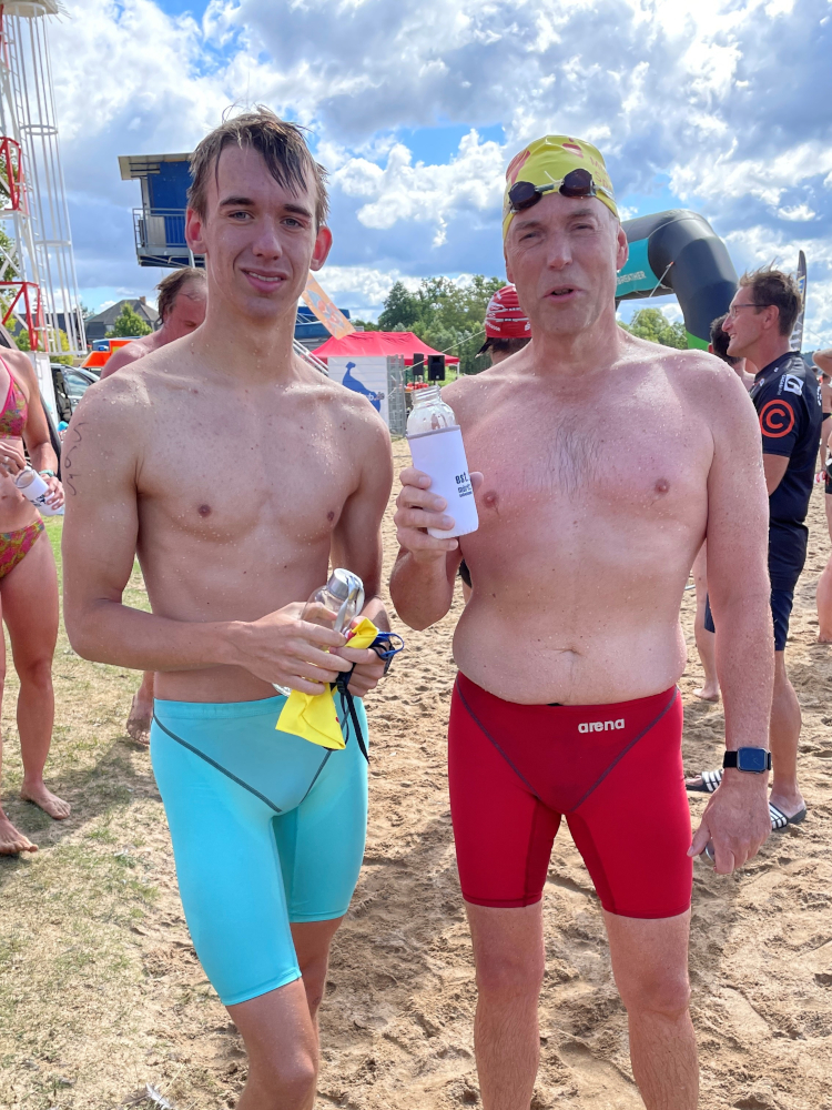 24. Juni: 11. Sonnenwendschwimmen am Kulkwitzer See. Im Licht der untergehenden Sonne gingen hier Matthias und Konrad über die 1500m an den Start und belegten bei den Männern die Plätze 7 und 11.