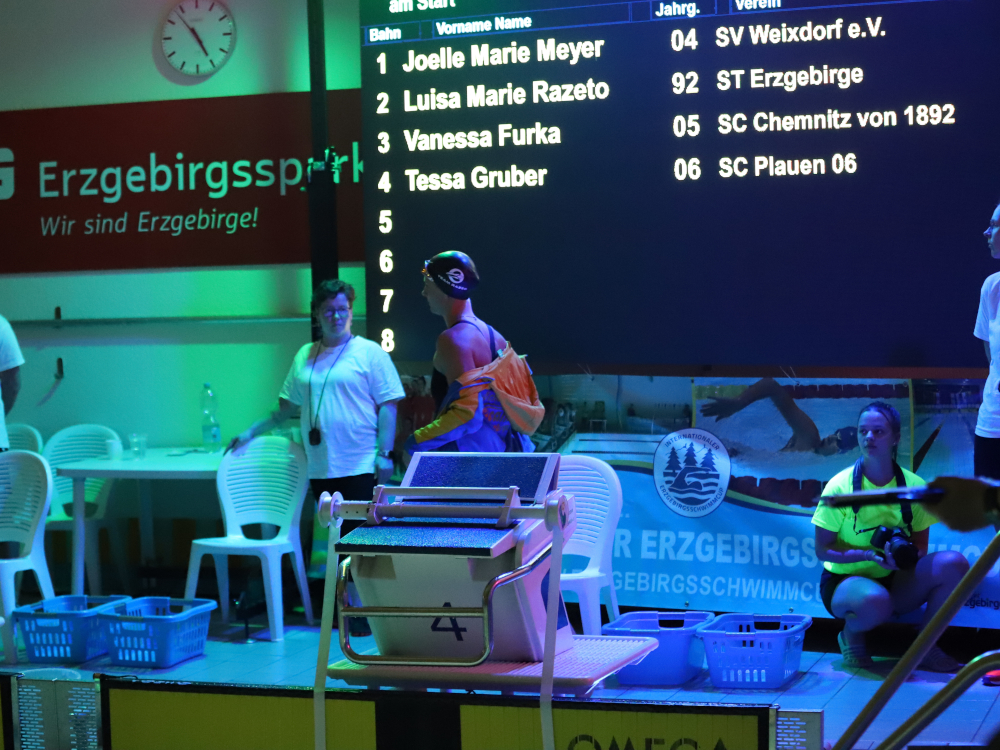 Los ging es am Samstag mit den jüngeren Schwimmbegeisterten. Nach der Eröffnung kämpften sie in 20 Einzel- und zwei Staffelwettkämpfen um die heiß begehrten Medaillen aus echt erzgebirgischer Volkskunst, dieses Jahr mit Schneemannmotiv. Ein besonderer Höhepunkt an diesem ersten Wettkampftag ist seit einiger Zeit der "Mini-Cup", der in der Mittagspause im Wettkampfbecken abgehalten wird. Hier dürfen die Jüngsten des STE bereits einmal Wettkampfluft schnuppern und im Wettkampfbecken ihr Können unter Beweis stellen. Zum Ende des Tages wird dann das Becken noch einmal richtig zum Kochen gebracht: die 4x50 m Lagen mixed Staffel steht an und wird souverän von den Sportlern und Sportlerinnen des SV 1919 Grimma dominiert, die auch die Mannschaftswertung mit über 300 Punkten Abstand zum zweitplatzierten TJ Slavie Chomutov gewinnen. Der Gastgeber Schwimmteam Erzgebirge kommt zunächst nur auf Platz 4 hinter den Kindern des SV Zwickau 04. Trotzdem waren die Trainer und Trainerinnen des STE sehr zufrieden: die vielen Medaillengewinne und unzähligen Bestzeiten ihrer Schützlinge konnten sich sehen lassen.