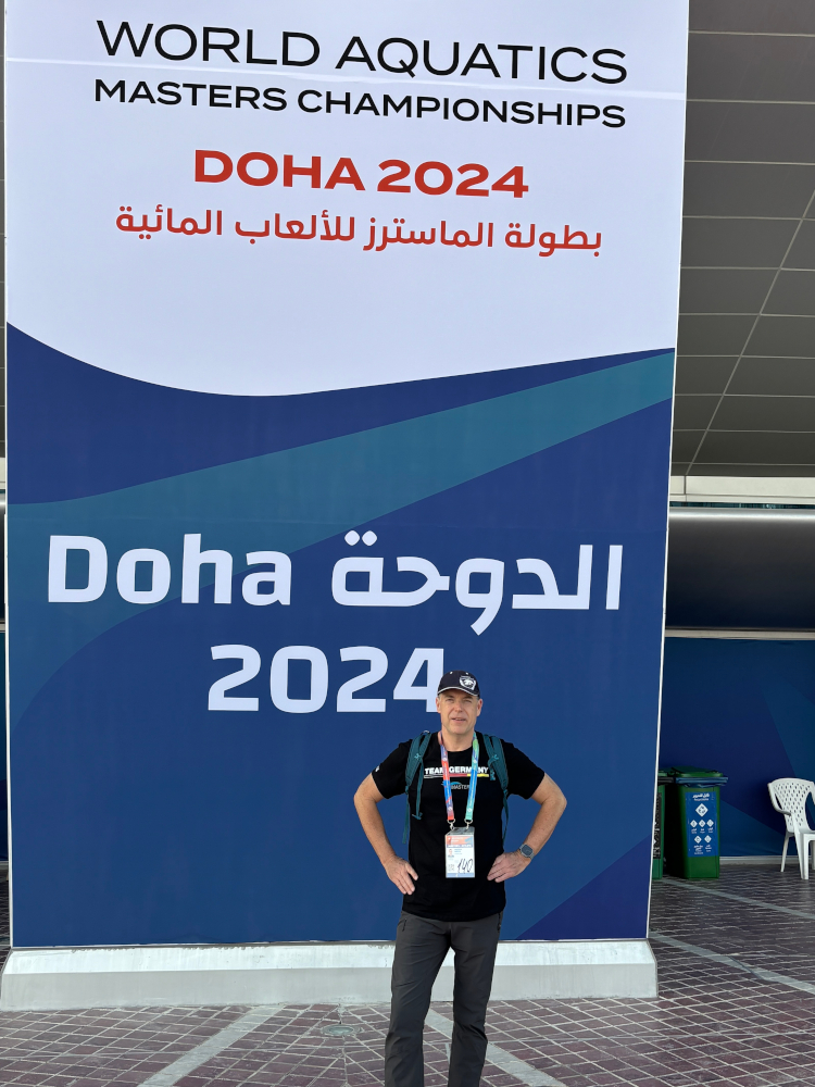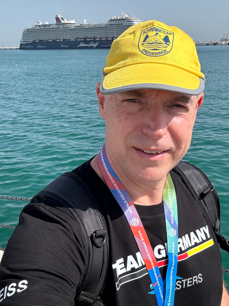 Im alten Hafen von Doha (Qatar), vor den Liegeplätzen der Kreuzfahrtschiffe, fanden die Freiwasserwettbewerbe der World Aquatics Masters Championships 2024 statt, an denen auch unser STE Masters Athlet Matthias Weiß an den Start ging. Bei blauem Himmel, Sonnenschein und angenehmen Temperaturen (Luft 26 °C, Wasser 20 °C) erkämpfte er sich über die 3 km Distanz im Persischen Golf in neuer persönlicher Bestzeit einen hervorragenden 20. Platz in der AK 50-54. Dass dabei auch der Spaß nicht zu kurz kam, war ihm nach dem Rennen ins Gesicht geschrieben.