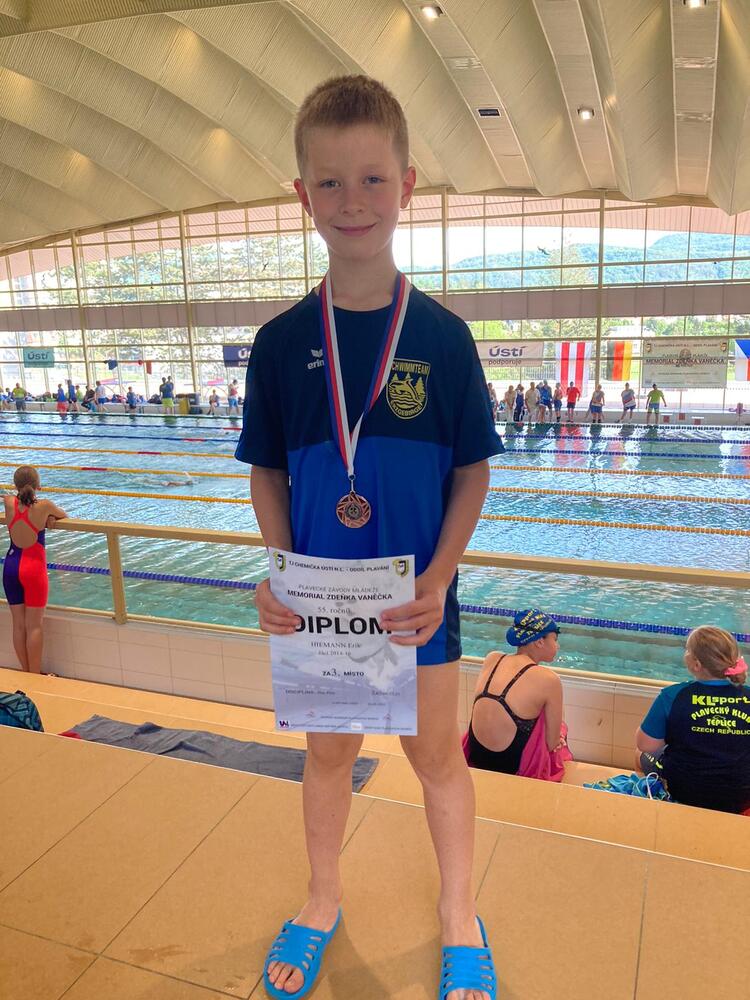 Während die Besten unserer Kadergruppe bei den Süddeutschen Meisterschaften in Ingolstadt ihr Bestes gaben (Extra-Beitrag), starteten am Samstag insgesamt 10 Aktive der Kader und Nachwuchsgruppe beim MEMORIÁL ZDEŇKA VANĚČKA in Usti nad Labem. Dabei ging es für unsere jüngsten Sportler Leonie Oestreich und Erik Hiemann (beide Jahrgang 2016) das erste Mal auf die Langbahn. Und das mit beachtlichen Ergebnissen. In einem gewohnt starken tschechischen Starterfeld konnte Erik Hiemann sogar eine Bronzemedaille über 50m Brust mit nach Hause nehmen. Auch die anderen Schwimmer überzeugten mit sehr guten und guten Leistungen und sicherten sich mit den erreichten Zeiten die Qualifikationen für die Anfang Juni in Dresden stattfindende Talentiade.