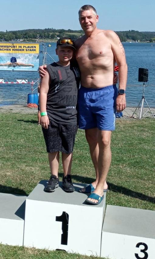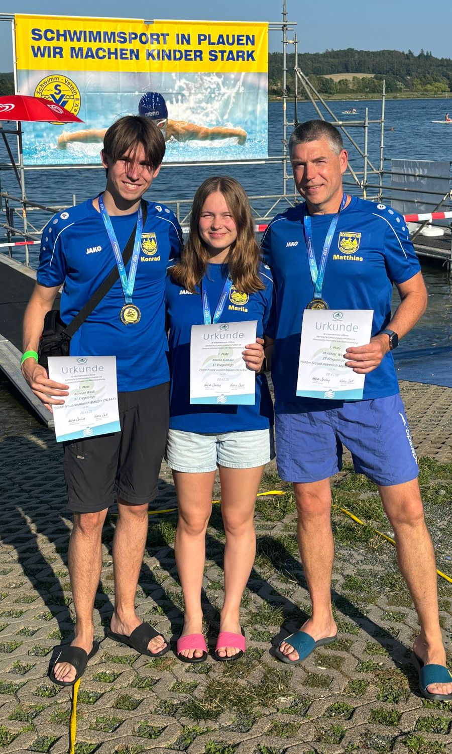 Zum Saisonabschluss der Freiwassersaison standen am Wochenende die Offenen Sächsischen Meisterschaften im Freiwasser mit Masterswertung an der Talsperre Pöhl an. Unser Schwimmteam war mit 5 Sportlerinnen und Sportlern vertreten. Nicht nur wegen des herrlichen Sommerwetters war es ein goldener Tag für unsere Athleten. Unsere Masters Mariia Katsala (AK W20), Konrad Weiß (AK M20) und Matthias Weiß (AK M50) gewannen mit starken Leistungen über die 2500 m Distanz jeweils Gold und wurden Sächsische Meister.