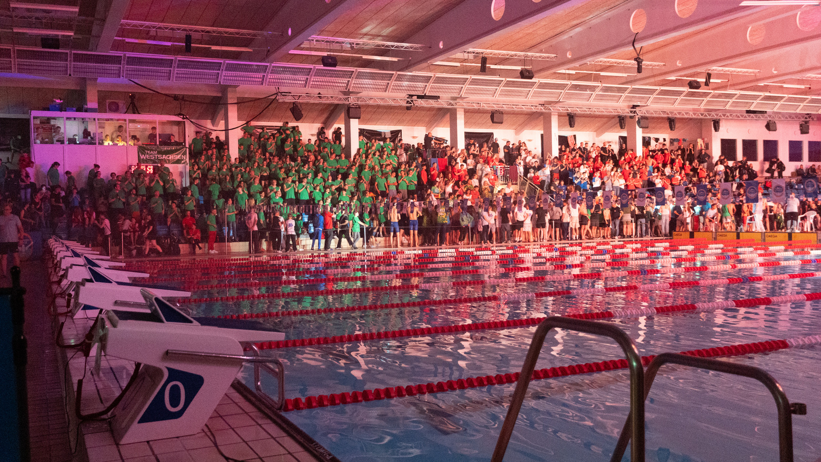 So starteten wir Donnerstag Nacht mit zwei voll bepackten Reisebussen in Richtung Norden. Nach gemeinsamem Grillen am Abend ging am nächsten Morgen der dreitägige Wettkampf los. In zwei Schwimmhallen treten die Kleinen und Großen von insgesamt 83 Vereinen in über 10.000 Einzelstarts gegeneinander an. Ein Sechstel aller Starts entfallen dabei auf die 178 Aktiven aus den 11 Vereinen unseres „Team Westsachsen“. Nach den Vorläufen am Vormittag folgen am Abend die Finals, welche am Freitag mit einer spektakulären Tanz- und Lichtshow eröffnet wurden.