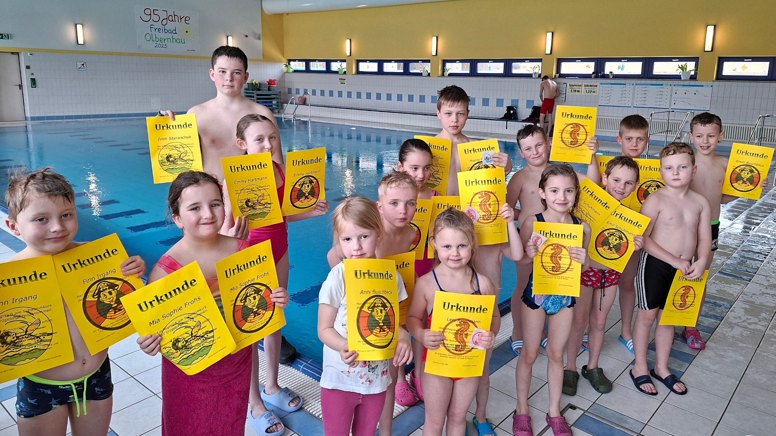 In dieser Woche konnten rund 40 Kinder aus unserem Schwimmteam erfolgreich ihr erstes Schwimmabzeichen – das Frühschwimmerabzeichen „Seepferdchen“ – ablegen. Seit Januar haben die Kinder gemeinsam mit viel Fleiß und Ausdauer trainiert und sich Schritt für Schritt ihrem Ziel genähert. Umso größer ist nun die Freude über den verdienten Erfolg!